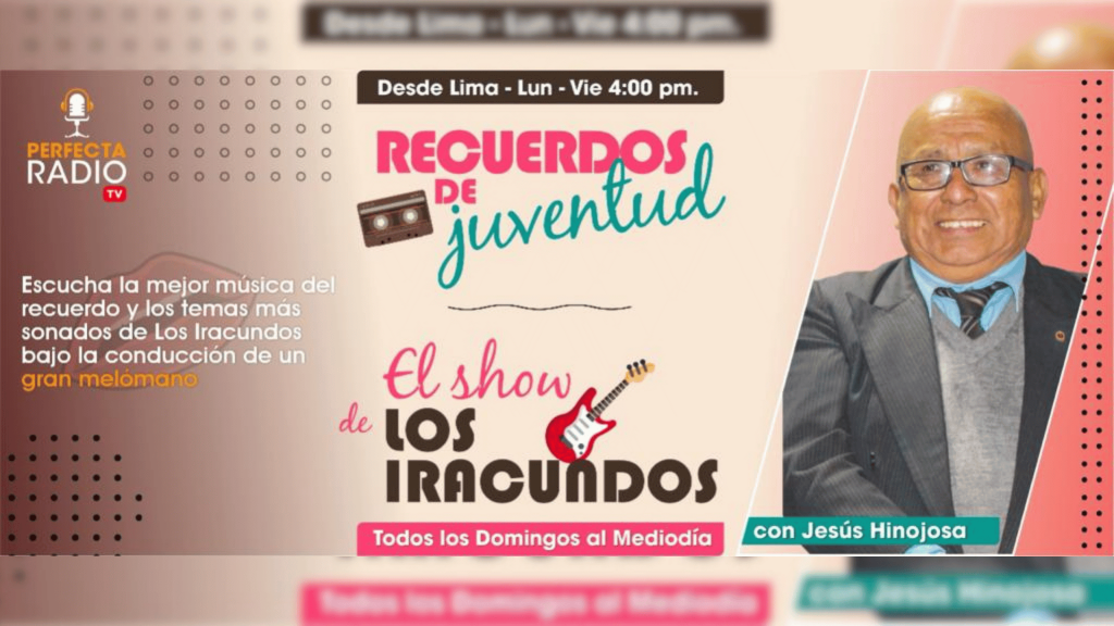 ENCESTANDO Conducción: Enrique Cornejo y Raúl TiradoHorario: Martes y JuevesPerú 7:00 pmNorteamérica 8:00 pmCentroamérica 6:00 pmEuropa +2:00 amJapón +9:00 amAustralia +10:00 am CRÓNICAS MERENGUE Conducción: Ichiro NakamuraHorario: Viernes y DomingoPerú 9:00 pmNorteamérica 10:00 pmCentroamérica 8:00 pmEuropa +4:00 amJapón +11:00 amAustralia +12:00 m RUMBO A LOS 50 Conducción: Fernando ChappellHorario: ViernesPerú 8:15 pmNorteamérica 9:15 pmCentroamérica 7:15 pmEuropa +3:15 amJapón +10:15 amAustralia +11:15 am CONOZCAMOS A BENIN Conducción: Séro DavidHorario: ViernesPerú 2:00 pmNorteamérica 3:00 pmCentroamérica 1:00 pmEuropa 9:00 pmJapón +9:00 amAustralia +10:00 am PERFECTA NOTICIA Conducción: Air NoticiasHorario: Lunes a ViernesPerú 12:00 mNorteamérica 1:00 pmCentroamérica 11:00 amEuropa 7:00 pmJapón +2:00 amAustralia +3:00 am VÍAS ARGENTINAS Conducción: Iván JuárezHorario: Lunes a JuevesPerú 8:00 pmNorteamérica 9:00 pmCentroamérica 7:00 pmEuropa +3:00 amJapón +10:00 amAustralia +11:00 am RONDA EDUCATIVA Conducción: Carlos Lino MéndezHorario: ViernesPerú 9:00 pmNorteamérica 10:00 pmCentroamérica 8:00 pmEuropa +4:00 amJapón +11:00 amAustralia +12:00 am TIEMPOS DE RADIO Conducción: Luis VarelaHorario: SábadosPerú 8:00 pmNorteamérica 9:00 pmCentroamérica 7:00 pmEuropa +3:00 amJapón +10:00 amAustralia +11:00 am AGROLIDER 360 Conducción: Gerardo de LeónHorario: Martes y JuevesPerú 7:00 pmNorteamérica 8:00 pmCentroamérica 6:00 pmEuropa +2:00 amJapón +9:00 amAustralia +10:00 am AMOR DE MADRE Conducción: Arminda del Valle y Natalia GerardHorario: Último domingo del mesPerú 7:00 pmNorteamérica 8:00 pmCentroamérica 6:00 pmEuropa +2:00 pmJapón +9:00 amAustralia +10:00 am 1 MUNDO DE 18 RUEDAS Conducción: José Luis GonzalesHorario: SábadosPerú 11:00 amNorteamérica 12:00 mCentroamérica 10:00 amEuropa 6:00 pmJapón +1:00 amAustralia +2:00 am MUNDO MARISTYA Conducción: Renzo CarmonaHorario: ViernesPerú 8:00 pmNorteamérica 9:00 pmCentroamérica 7:00 pmEuropa +3:00 amJapón +10:00 amAustralia +11:00 am ARACA TANGO Conducción: Mónica HernándezHorario: Sábado y DomingoPerú 9:00 amNorteamérica 10:00 amCentroamérica 8:00 amEuropa 4:00 pmJapón 11:00 pmAustralia 12:00 am RESILIENCIA Conducción: Hugo JollyHorario: ViernesPerú 8:00 pmNorteamérica 9:00 pmCentroamérica 7:00 pmEuropa +3:00 amJapón +10:00 amAustralia +11:00 am MUJERES CON PROPÓSITO Conducción: Celia CorderoHorario: miércolesPerú 7:00 pmNorteamérica 8:00 pmCentroamérica 6:00 pmEuropa +2:00 amJapón +9:00 amAustralia +10:00 am ZENTIMIENTOS Conducción: Hugo JollyHorario: LunesPerú 3:00 pmNorteamérica 4:00 pmCentroamérica 2:00 pmEuropa 10:00 pmJapón +5:00 amAustralia +6:00 am MÚSICA ORQUESTADA Conducción: Hugo JollyHorario: DomingosPerú 8:00 pmNorteamérica 9:00 pmCentroamérica 7:00 pmEuropa +3:00 amJapón +10:00 amAustralia +11:00 am MÚSICA CRIOLLA Conducción: Hugo JollyHorario: DomingosPerú 8:00 pmNorteamérica 9:00 pmCentroamérica 7:00 pmEuropa +3:00 amJapón +10:00 amAustralia +11:00 am AUDIO VINTAGE Conducción: Mónica HernándezHorario: JuevesPerú 8:00 pmNorteamérica 9:00 pmCentroamérica 7:00 pmEuropa +3:00 amJapón +10:00 amAustralia +11:00 am NVER GIVE UP Conducción: Eduardo RochaHorario: SábadosPerú 8:00 pmNorteamérica 9:00 pmCentroamérica 7:00 pmEuropa +3:00 amJapón +10:00 amAustralia +11:00 am PÉNDULOS CLÁSICOS Conducción: Perfecta RadioHorario: SábadosPerú 8:00 pmNorteamérica 9:00 pmCentroamérica 7:00 pmEuropa +3:00 amJapón +10:00 amAustralia +11:00 am SABOR A COCO Conducción: Perfecta RadioHorario: Lunes a ViernesPerú 8:00 pmNorteamérica 9:00 pmCentroamérica 7:00 pmEuropa +3:00 amJapón +10:00 amAustralia +11:00 am RENACER ANDINO Conducción: Perfecta RadioHorario: DomingosPerú 8:00 pmNorteamérica 9:00 pmCentroamérica 7:00 pmEuropa +3:00 amJapón +10:00 amAustralia +11:00 am DIÁLOGOS CON RITMO Conducción: Dinora UvalleHorario: SábadosPerú 8:00 pmNorteamérica 9:00 pmCentroamérica 7:00 pmEuropa +3:00 amJapón +10:00 amAustralia +11:00 am HOLA K TAL Conducción: Walter ChatterHorario: Lunes a ViernesPerú 8:00 pmNorteamérica 9:00 pmCentroamérica 7:00 pmEuropa +3:00 amJapón +10:00 amAustralia +11:00 am CHAPPELL COMENTA Conducción: Fernando ChappellHorario: MartesPerú 8:00 pmNorteamérica 9:00 pmCentroamérica 7:00 pmEuropa +3:00 amJapón +10:00 amAustralia +11:00 am FITNESS RADIO Conducción: Luis Miguel SalazarHorario: ViernesPerú 8:00 pmNorteamérica 9:00 pmCentroamérica 7:00 pmEuropa +3:00 amJapón +10:00 amAustralia +11:00 am LENIN COMENTA Conducción: Lenin RodriguezHorario: ViernesPerú 8:00 pmNorteamérica 9:00 pmCentroamérica 7:00 pmEuropa +3:00 amJapón +10:00 amAustralia +11:00 am POLÍTICA DEPORTIVA Conducción: Luis Miguel SalazarHorario: ViernesPerú 8:00 pmNorteamérica 9:00 pmCentroamérica 7:00 pmEuropa +3:00 amJapón +10:00 amAustralia +11:00 am PUENTE CULTURAL Conducción: Fernando ChappellHorario: SábadosPerú 8:00 pmNorteamérica 9:00 pmCentroamérica 7:00 pmEuropa +3:00 amJapón +10:00 amAustralia +11:00 am SEXTEMA Conducción: PriyanandaHorario: ViernesPerú 8:00 pmNorteamérica 9:00 pmCentroamérica 7:00 pmEuropa +3:00 amJapón +10:00 amAustralia +11:00 am TU BRÚJULA INTERIOR Conducción: Carmen SosaHorario: SábadosPerú 8:00 pmNorteamérica 9:00 pmCentroamérica 7:00 pmEuropa +3:00 amJapón +10:00 amAustralia +11:00 am ENTREVISTANDO ANDO Conducción: Walter ChatterHorario: SábadosPerú 8:00 pmNorteamérica 9:00 pmCentroamérica 7:00 pmEuropa +3:00 amJapón +10:00 amAustralia +11:00 am EL AMAGUE Conducción: Jorge EgoavilHorario: LunesPerú 8:00 pmNorteamérica 9:00 pmCentroamérica 7:00 pmEuropa +3:00 amJapón +10:00 amAustralia +11:00 am SUPER DEPORTE Conducción: Raúl MaravíHorario: Lunes a ViernesPerú 8:00 pmNorteamérica 9:00 pmCentroamérica 7:00 pmEuropa +3:00 amJapón +10:00 amAustralia +11:00 am RECUERDOS DE JUVENTUD Conducción: Jesús HinojosaHorario: Lunes a ViernesP